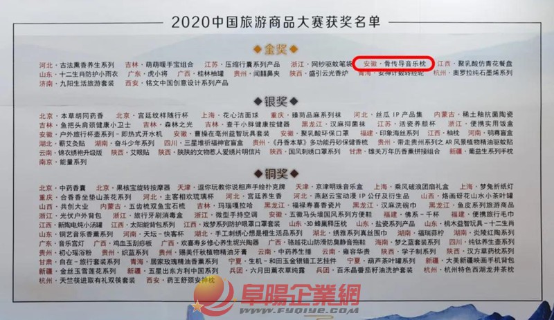 近日,在浙江省義烏市國際博覽中心舉行的2020中國旅游商品大賽中,界首市選送的旅游商品吉祥三寶骨傳導音樂枕榮獲大賽金獎!