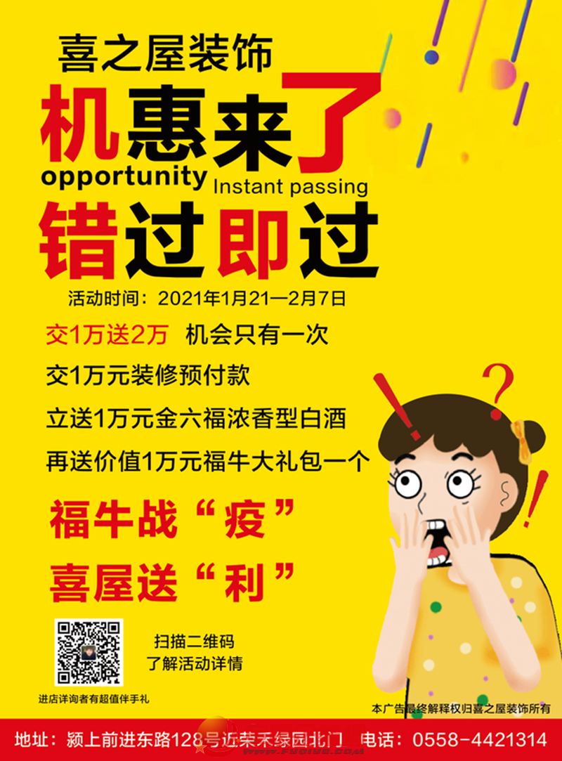 家是溫暖的港灣,無論何時(shí),都應(yīng)該讓家變成自己喜歡的樣子。在歡快的節(jié)日里,與愛的人團(tuán)聚,這便是家承載的最美好的意義。十平米大的空間也好,兩百平的豪華住宅也好,只要是家,就該讓喜歡的東西圍繞左右。春節(jié)將至,你的新家裝修了嗎? 辭舊迎新之際,潁上喜之屋裝飾特推三重豪禮裝新家活動(dòng): 一、僅需12.98萬,得別克英朗轎車一輛,得三室兩廳、一廚一衛(wèi)全屋裝修(110平米以內(nèi)) 二、交10000元裝修預(yù)付金,送10000元金六福濃香型白金,再送10000元福牛大禮包一個(gè)。 三、進(jìn)店詳詢均有大禮相送。 據(jù)潁上喜之屋裝飾工程有限公司總經(jīng)理劉建國介紹,喜之屋裝飾是一家集室內(nèi)外裝修設(shè)計(jì)工程、鋼結(jié)構(gòu)工程、亮化工程、園林工程、玻璃幕墻門窗安裝、裝飾材料銷售等一體的裝飾工程公司。 公司與偉星管、華帝高端智能廚電、歐福萊陶瓷、雷士照明、生活家地板、蘭舍硅藻泥、歐派櫥柜、馬可波羅瓷磚、日豐管業(yè)、奧普集成吊頂、東鵬瓷磚、大自然地板箭牌衛(wèi)浴瓷磚、火星人集成灶、格力、美的等20多家知名品牌強(qiáng)強(qiáng)聯(lián)手,精心為您打造一個(gè)溫馨而又滿意的新家。 福牛戰(zhàn)“役”、喜屋送“利”,公司向廣大客戶承諾:一站服務(wù)、量身定制、專業(yè)貼心、上門量房、免費(fèi)報(bào)價(jià)、竣工驗(yàn)收、免費(fèi)驗(yàn)房、免費(fèi)量房、免費(fèi)設(shè)計(jì)、免費(fèi)咨詢,凡是在抗疫期間作出貢獻(xiàn)的醫(yī)護(hù)人員、軍人、公安干警、公益愛心人士、社區(qū)執(zhí)勤人員優(yōu)先享有活動(dòng)權(quán)益。 公司地址:潁上縣前進(jìn)路128號(榮禾綠園北門東側(cè)) 裝修咨詢電話:0558—4421314 本活動(dòng)最終解釋權(quán)歸潁上喜之屋裝飾工程有限公司所有! |